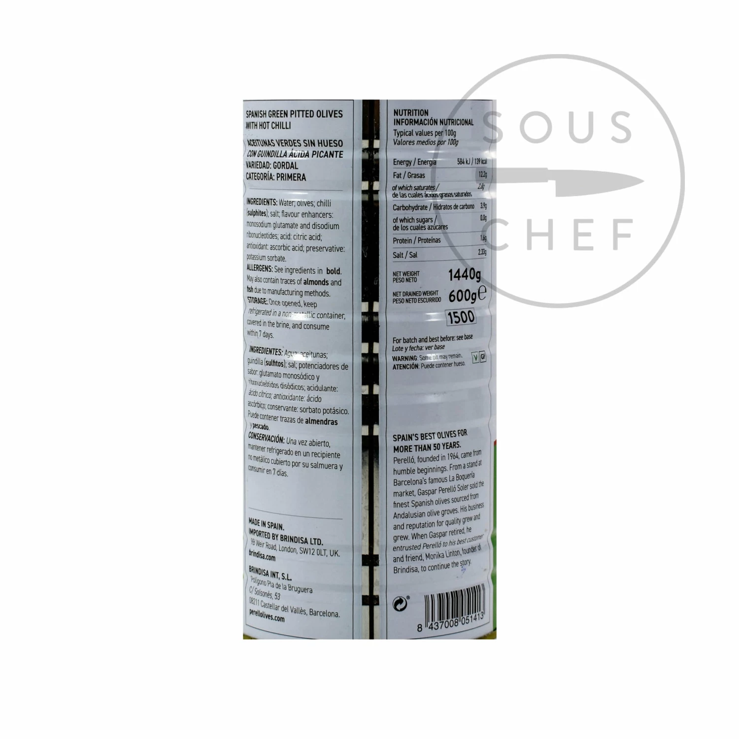 Perello Gordal pitted olives are a cult favourite among olive cognoscenti. Gordal olives are one of the finest Spanish olives – bright green, plump and crisp. These Gordal olives are tinned in brine with guindilla chilli – giving the olives a slight hot kick. Drain and serve the Gordal olives for a pre-dinner bite, or enjoy as part of an antipasti selection with cold meats and cheese. The mildly spicy olives are also a great addition to salads.