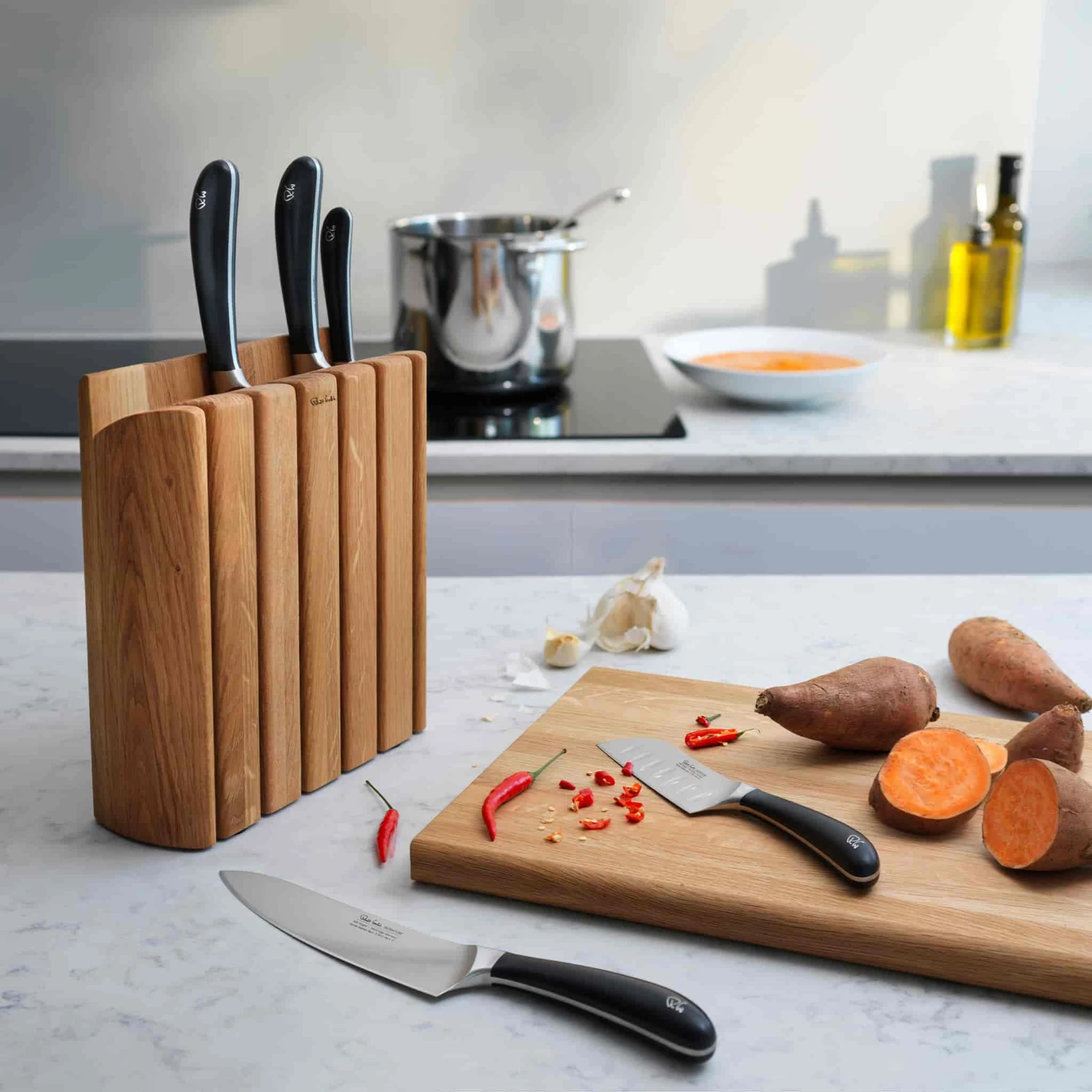 The Robert Welch Signature Book Knife Block has been designed in consultation with professional chefs and is a practical, stylish, safe way to store the essential knives every cook needs. The solid oak block has silicone feet for stability, and upright slots for each knife for quick access.