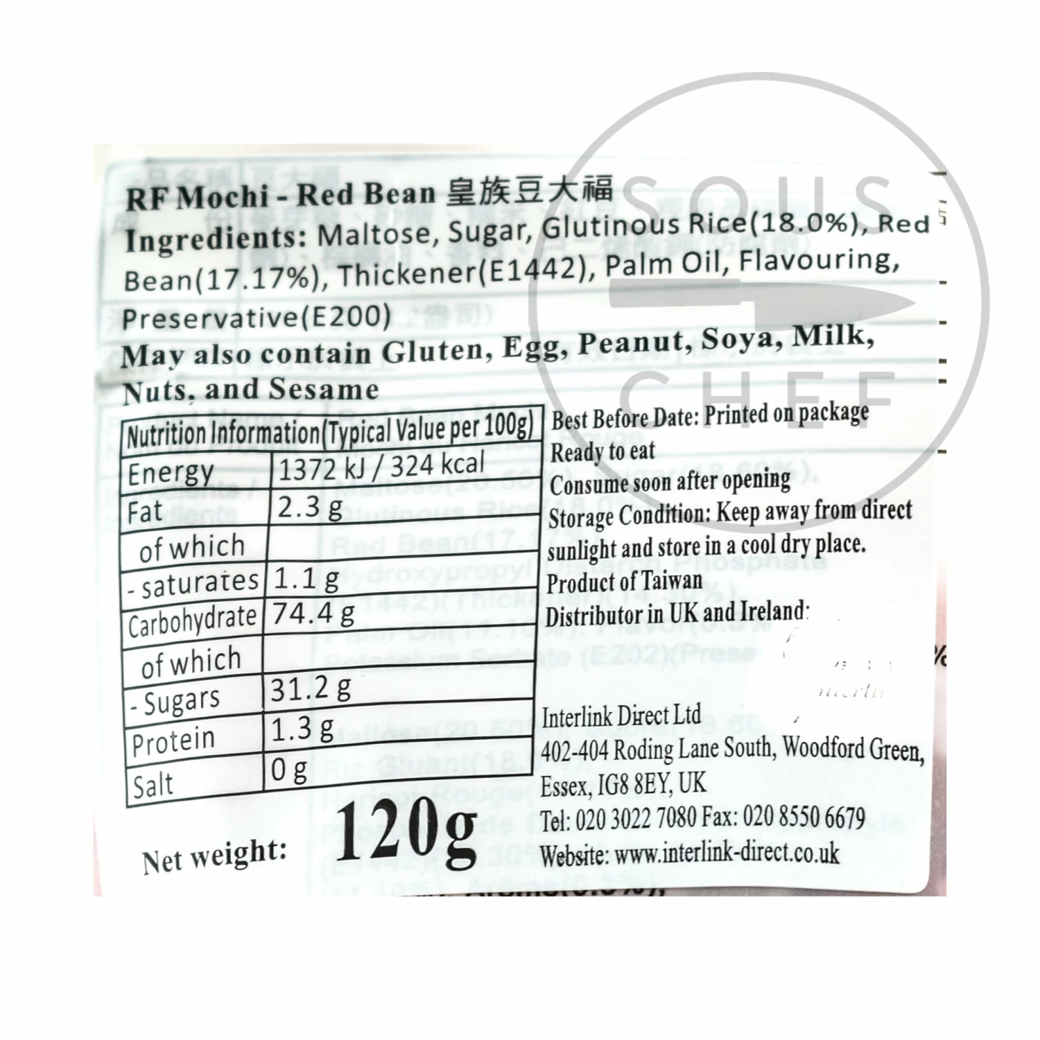 Ingredients: Maltose, sugar, glutinous rice (18%), red bean (17.17%), thickener (E1442), palm oil, flavouring, preservative (E200)