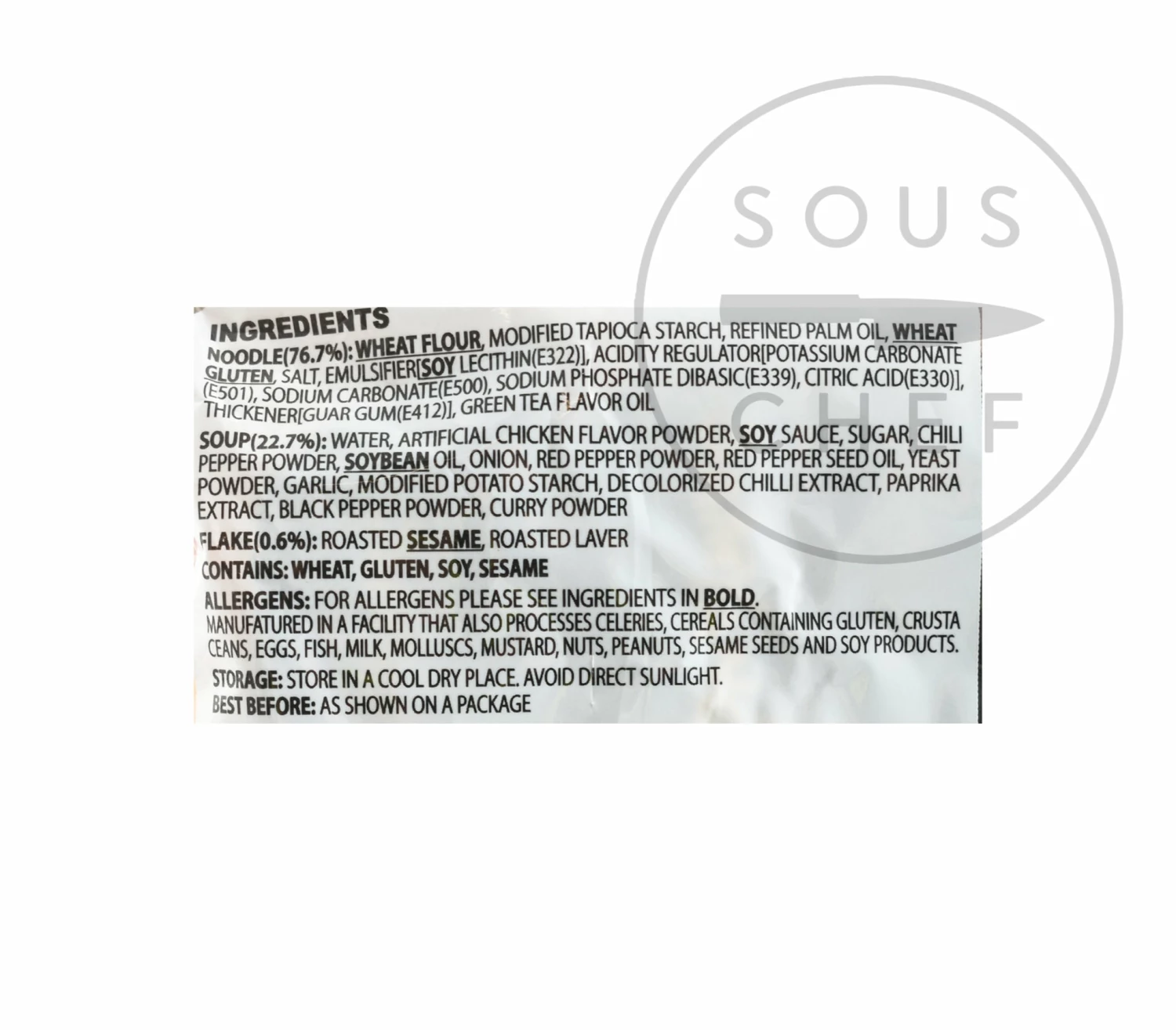 Ingredients: Noodles (76.7%): wheat flour, modified tapioca starch, refined palm oil, wheat gluten, salt, emulsifier (soy lecithin (E322)), acidity regulator (potassium carbonate (E501), sodium carbonate (E500), sodium phosphate dibasic (E339), citric acid (E330)), thickener (guar gum (E412)), green tea flavour oil. Soup (22.7%): water, artificial chicken flavour powder, soy sauce, sugar, chilli pepper powder, soybean oil, onion, red pepper powder, red pepper seed oil, yeast powder, garlic, modified potato starch, decolourized chilli extract, paprika extract, black pepper powder, curry powder. Flake (0.6%): roasted sesame, roasted laver.