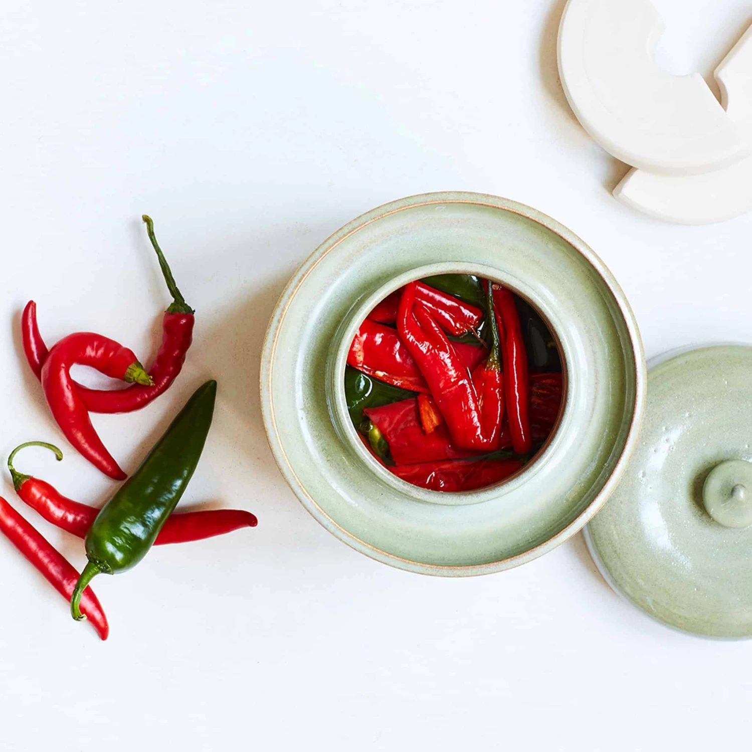 This handmade stoneware fermenting crock in green is a beautiful piece of kitchen equipment for those that love making sauerkraut, kimchi and pickles at home.
