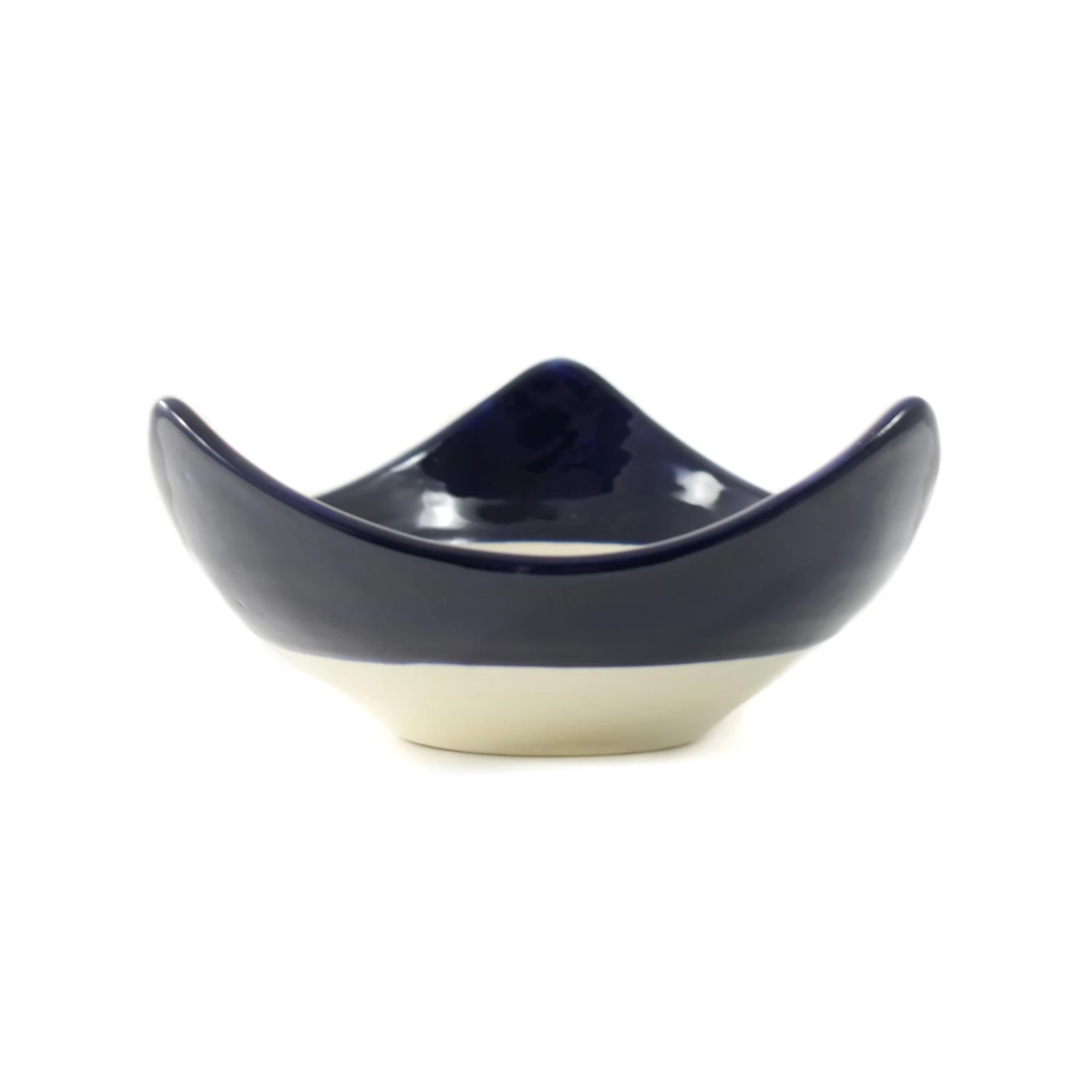 This traditional Andalucia small serving bowl has an unusual triangular shape and is decorated in dark blue and cream glazed detail. Use it for serving olives of salted nuts with a cold beer, or for dishing up classic Spanish tapas such as prawns and garlic.