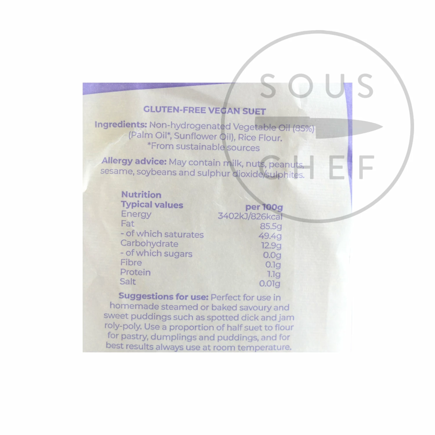 Vegetarian suet is ideal for making vegetarian dumplings, pastries and puddings. It contains only vegetable oils, so it’s vegetarian and vegan-friendly, too. Use vegetarian suet to make classic British puddings, like jam roly poly or spotted dick.