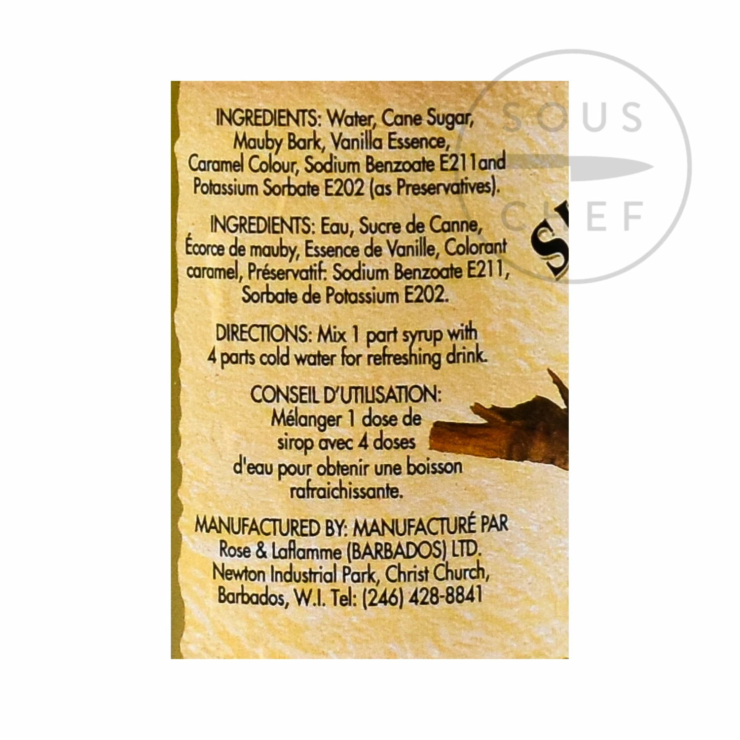 Ingredients: Water, cane sugar, mauby bark, vanilla essence, caramel colour, sodium benzoate E211 and potassium sorbate E202 (preservatives).Â
