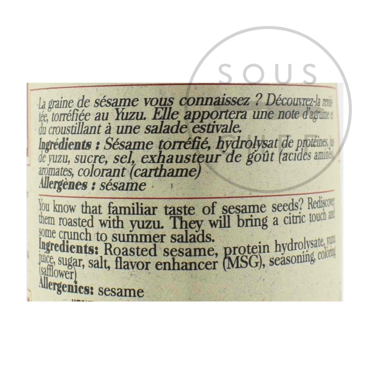 Ingredients:Â roasted sesame, protein hydrolysate, yuzu juice, sugar, salt, flavour enhancer (MSG), seasoning, colouring (safflower).