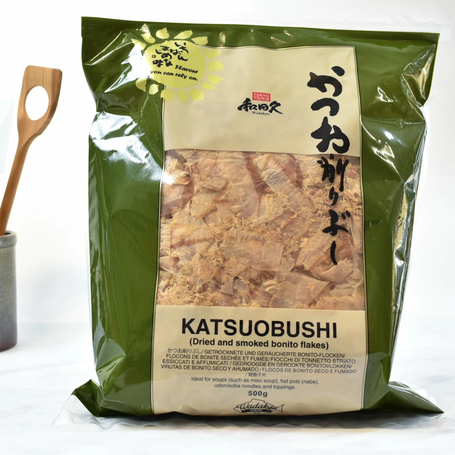 Katsuo Bushi bonito flakes, or katsuobushi, are tissue-paper thin fish shavings with intense umami flavours. They come from a tuna-like Pacific fish which is dried, fermented to wood-like hardness and then smoked. Use along with dried kelp to form the base of the Japanese stock dashi.
